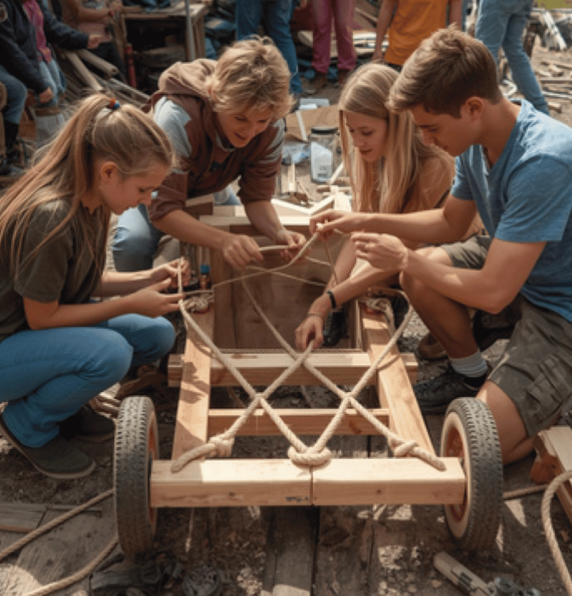 Die Anfertigung unseres „Rotkreuz-Steinzeit-Mobils“ ist weit mehr als nur ein handwerkliches Projekt – es ist ein mitreißendes Erlebnis, das Kreativität und Kommunikationsfähigkeit fördert. In kleinen Gruppen entwerfen und bauen die Teilnehmenden ihr eigenes Auto. Ausgestattet mit Holzlatten, Brettern, Rädern und Seilen, ist Kreativität und Teamarbeit gefragt, um ein fahrtüchtiges Gefährt zu konstruieren.